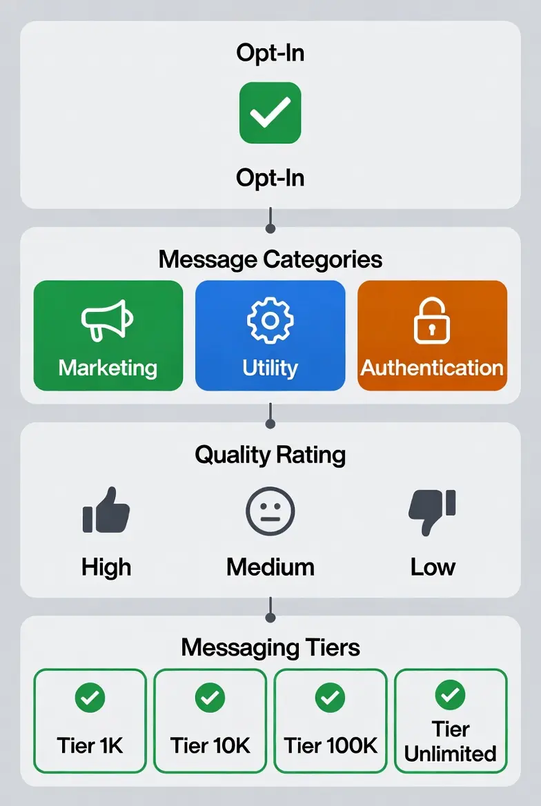 Quality ratings control your limits. WhatsApp scores your account as High, Medium, or Low based on user feedback (blocks, reports, engagement). Low quality = reduced sending capacity or bans—crucial for Dubai businesses competing in saturated markets.